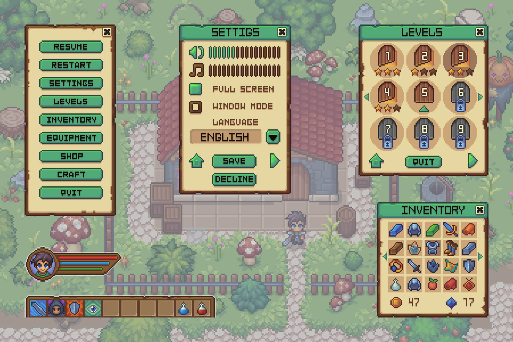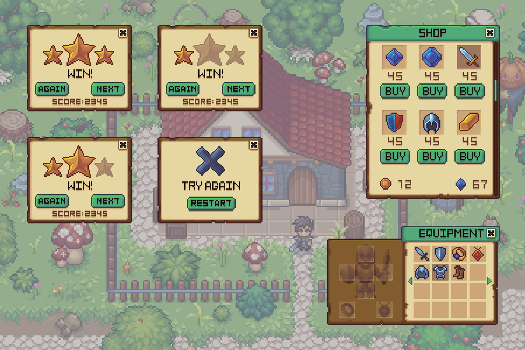 • Windows and menus: settings, shop, levels, equipment, crafting, inventory, and victory/defeat screens.