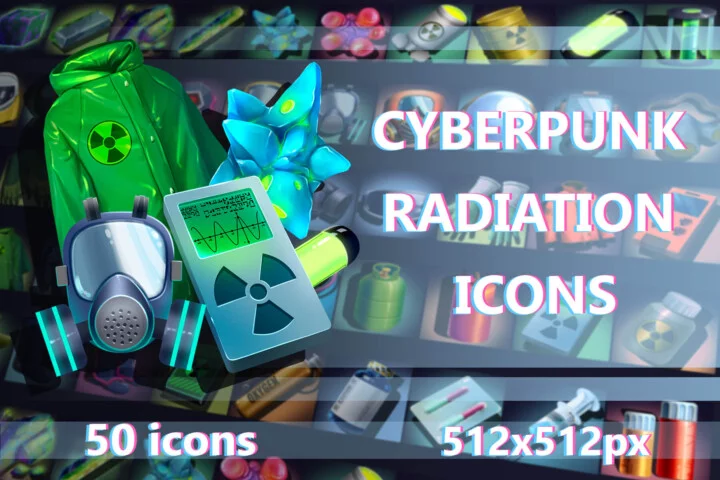 Get ready to transform your game content with Free Cyberpunk Radiation Game Icons. This collection of futuristic, high-quality assets is designed to add a unique touch to your cyberpunk universe. This set is filled with carefully crafted icons, each inspired by the neon aesthetic and harsh atmosphere of cyberpunk worlds. Suits, helmets, gloves and boots that protect against chemical emissions, various gas cylinders, ampoules, barrels of radioactive waste, uranium rods, artifacts and much more variety.