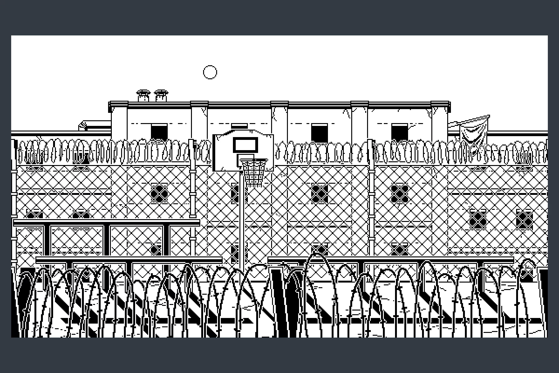 - The inner yard with razor wire, benches, and an old basketball hoop;
