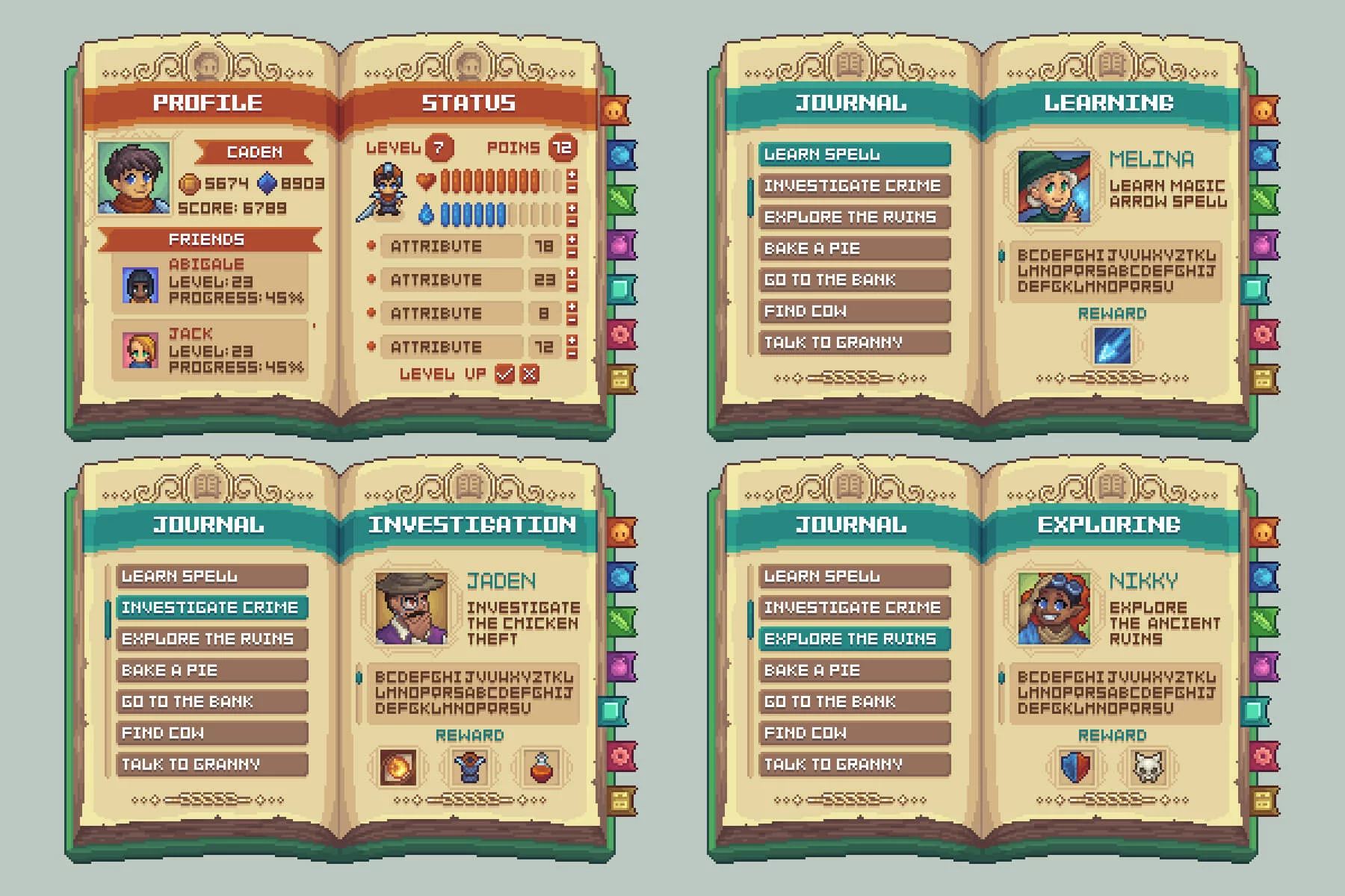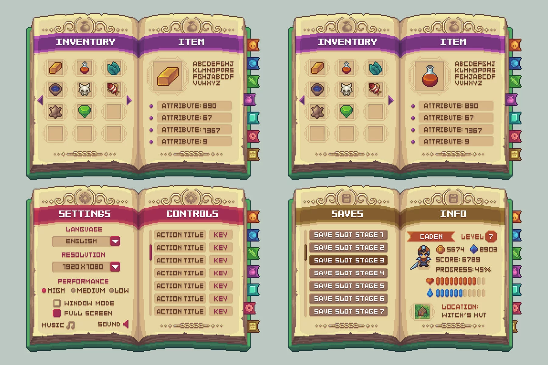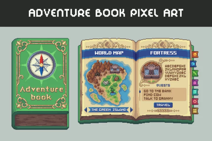 Adventure Fantasy Book Pixel Art is a high-quality and original solution for game developers, designers, and writers looking to bring game worlds to life through detailed visual storytelling. This set builds on the concept of interactive fantasy books, combining classic RPG aesthetics with the modern precision of pixel art. It is designed to enable creators to transform simple user interface elements into captivating storytelling tools. Unlike standard interface elements, this set focuses on thematic consistency and narrative depth. Each element is constructed to feel like part of a living fantasy universe. Instead of isolated graphic elements, you get a coherent, step-by-step system. It can be used to create quest logs, spellbooks, lore journals, or inventory menus. These capabilities make it particularly valuable for many genres, including RPGs, MMOs, combat, exploration, survival, adventure, travel, runner games, and side-scrollers.
