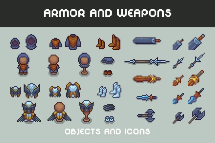 Immerse yourself in a world of steel, strategy, and heroic progression with Armor and Weapons Pixel RPG Icons. It is a truly massive collection of beautifully crafted pixel art gear created for fantasy game developers and retro-inspired creators. Whether you’re creating a classic RPG, exploration, survival, roguelike adventure, MMO with a loot system, or a top-down, runner-compatible quest, this set will provide everything you need to fill your world with legendary gear, rare treasures, and unforgettable battles. Open the repository and you’ll discover a huge variety of armor, weapon, shield, and gear icons, all rendered in a charming pixel art style. Each icon is designed to make inventory, shops, crafting menus, and loot drops feel immersive and satisfying.