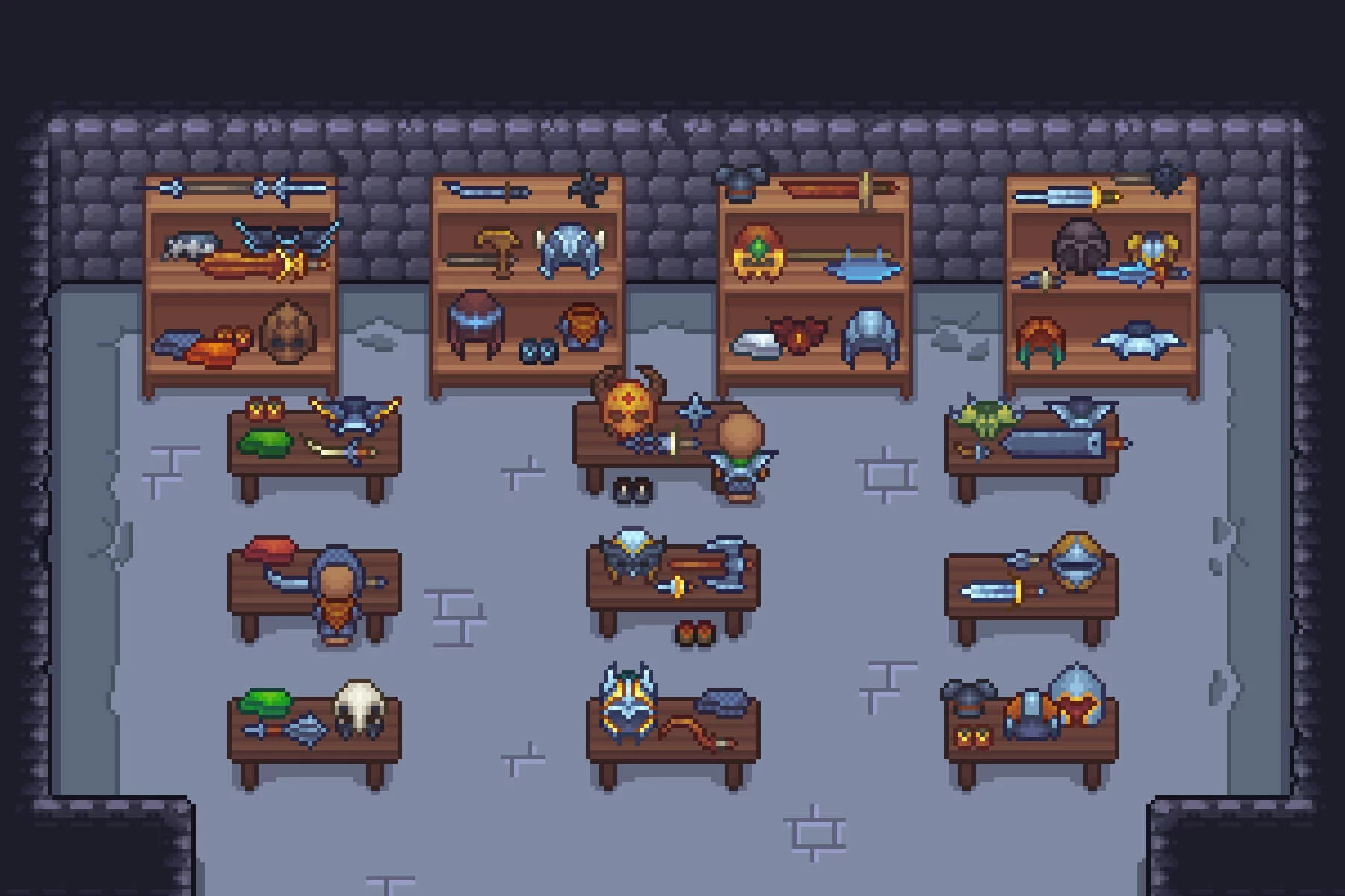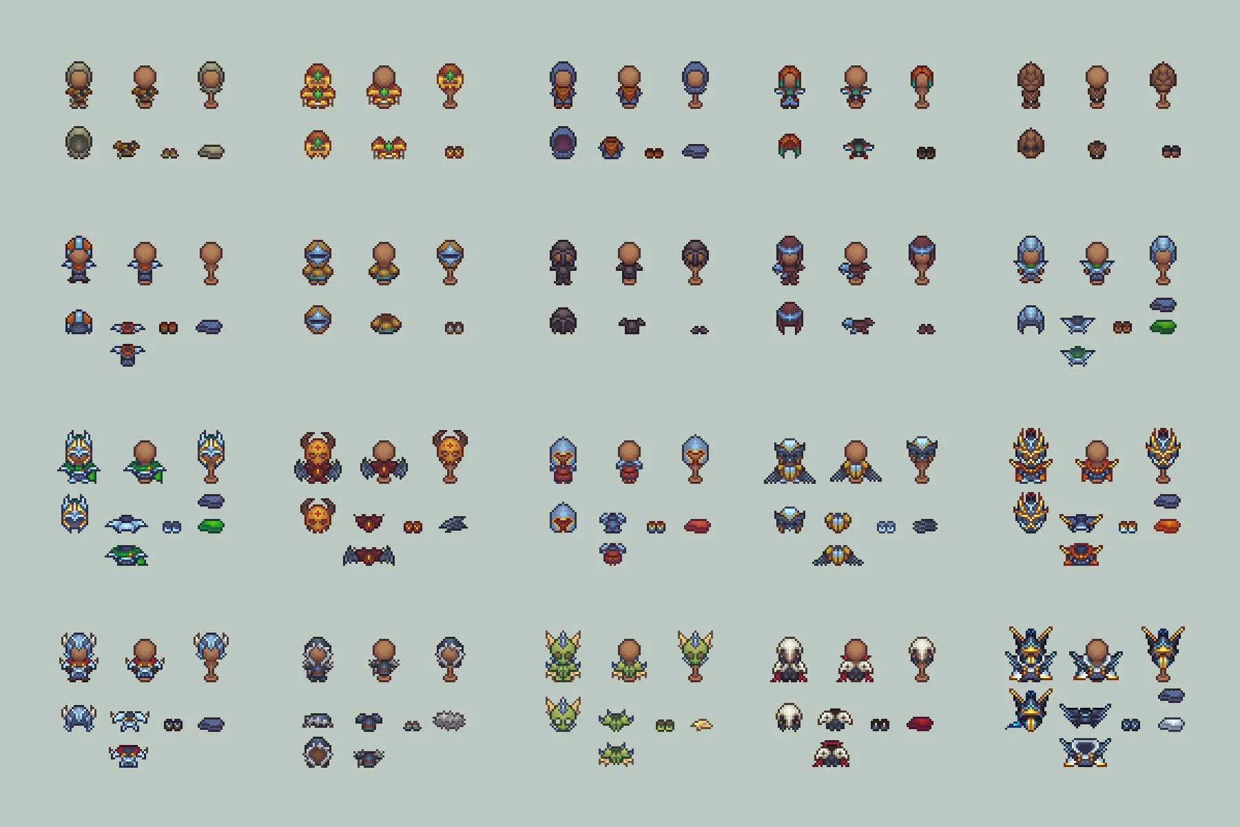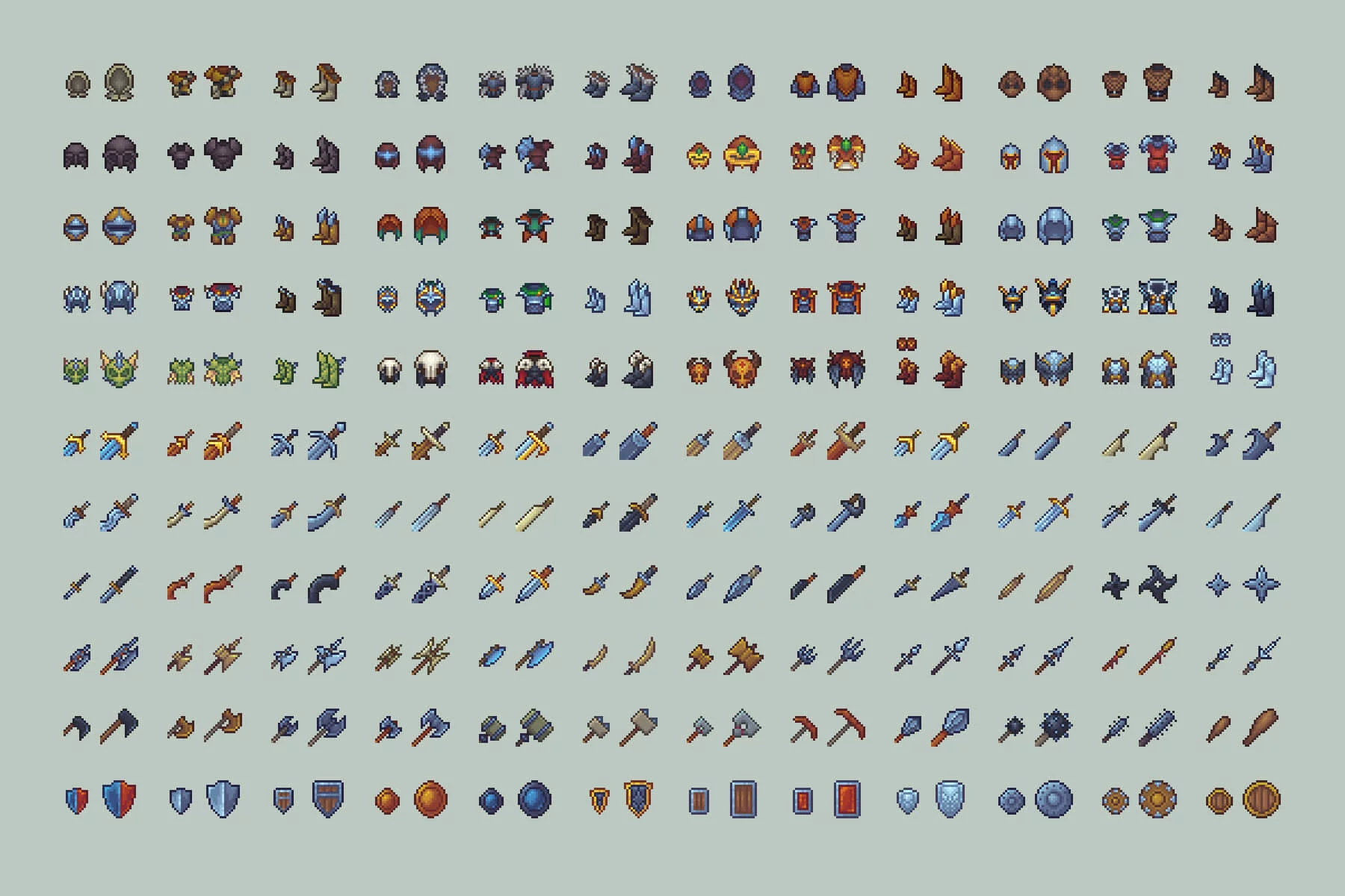 A huge selection of armor ranges from full sets, including helmets and chestplates, to individual pieces such as boots. It varies not only in color but also in material, including iron, gold, handcrafted leather, mage-enchanted gear, or armor skillfully shaped to intimidate enemies with enormous iron wings or trophy enemy bones covering the entire set. Furthermore, there are many unique medieval weapons capable of helping your players overcome any threat in battle. Sharp swords, unique blades, intricately shaped daggers, shields crafted from rare ores and materials, hammers, and axes of various sizes with unique properties are all included. Everything is here to create a truly unique battle atmosphere, a captivating research or enchantment tree, and an overall engaging game that will attract the attention of the community. All icons are fully customizable and easily edited in tools like Aseprite, Photoshop, or other pixel art programs, allowing you to recolor gear, create rarity tiers, or design unique Legendary sets for your own universe.