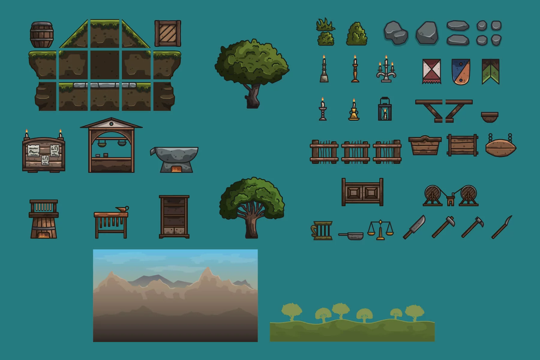 - Natural and outdoor resources: Trees, bushes, simple landscape elements, tiles and backgrounds that complete the look of a medieval town.