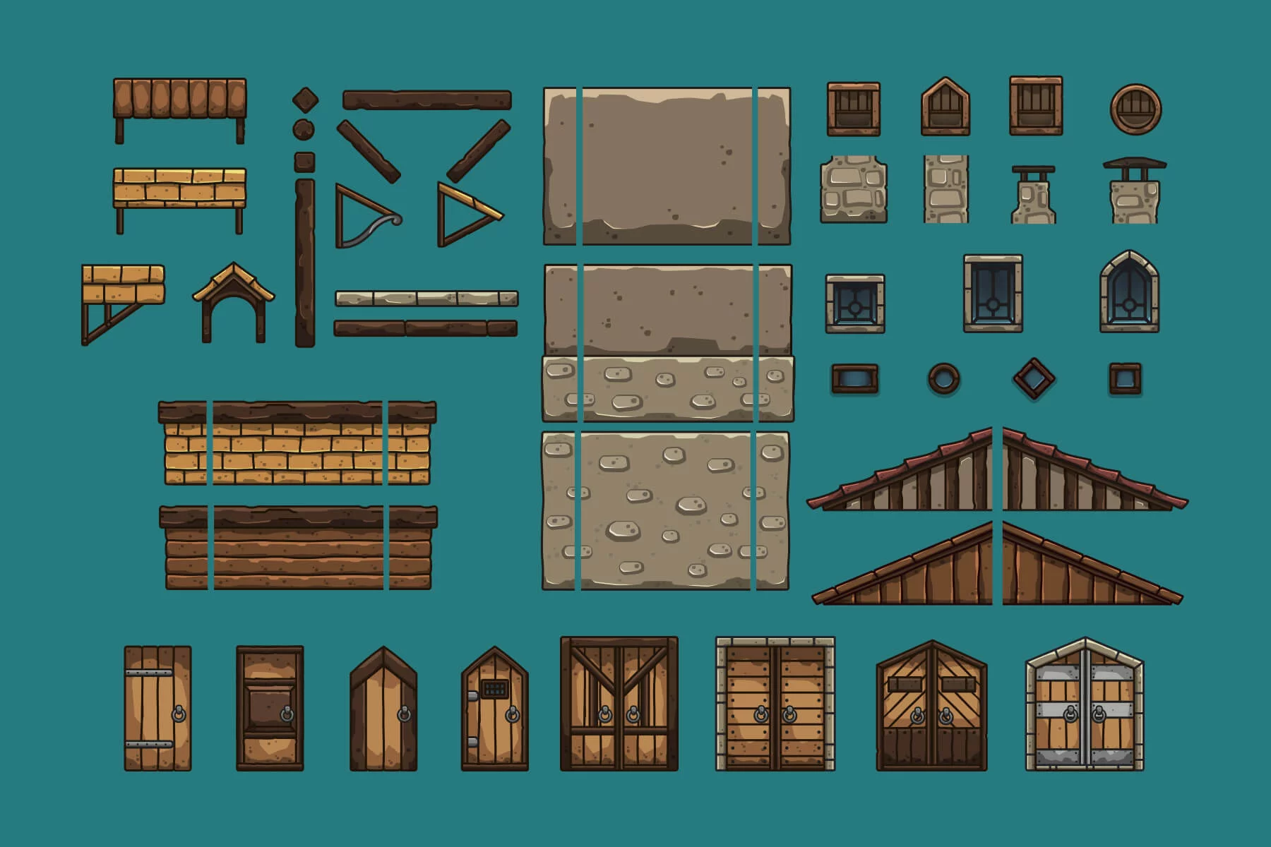 Beyond the workshop interior, the tileset includes modular building elements (walls, floors, roofs, beams, fences, and support structures), giving you the flexibility to design anything from a small corner shed to a full production district. Construct cozy village homes, merchant stalls, or entire leatherworking compounds with easy snap-together tiles.