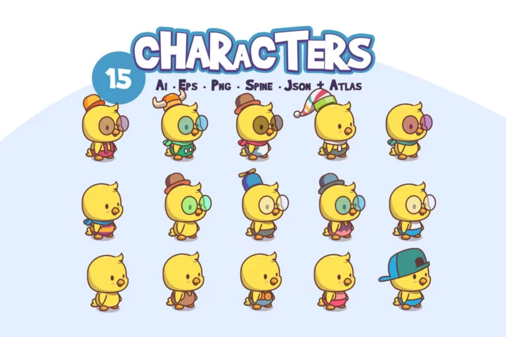 Each chick has special details that make all 15 characters unique. Some carry an umbrella, others wear an interesting cap or scarf, glasses, or even a helmet. All this allows you to easily bring a special uniqueness to your game project. And a whole set of amazing motion animations, including idle, walk, stunned, fly, jump, hit and more, gives you the opportunity to quickly add more realism to their movements. Their vector design also allows for easy editing in tools like Adobe Illustrator. Thus, allowing you to easily customize colors, styles or accessories to suit your vision.