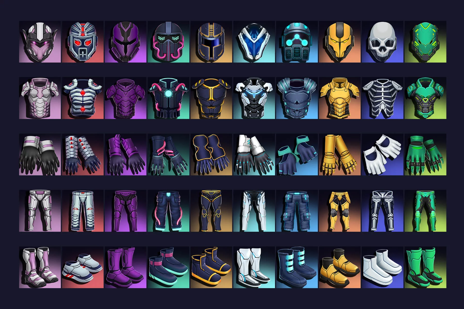 Introducing Cyberpunk Armor Icons Pack 3 for Sci-Fi Games. It is a must-have set for developers looking to outfit their futuristic heroes with cutting-edge protection and stylish, high-tech design. This collection brings together a variety of armor pieces, 50 in total, that perfectly capture the harsh neon atmosphere of cyberpunk worlds. They make your inventory, loot drops, and character progression brighter than ever before.