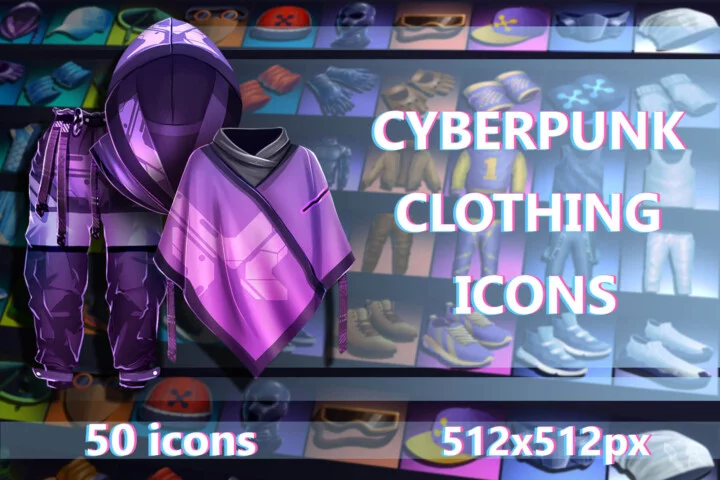 Featuring a wide range of 50 icons, this set includes: headwear and masks (from tactical visors and hoods to high-tech bandanas and respirators), gloves and sleeves (crafted from high-tech materials that provide superior traction and a combat advantage in the urban jungle), jackets, ponchos and tank tops, pants and leggings (from form-fitting cyber trousers to baggy hacker pants that provide both agility and durability for fast-paced chases and battles), high-performance sneakers, tactical boots and cyber-enhanced footwear designed for speed, endurance and style. Designed with a bold, futuristic aesthetic, these high-quality icons are perfect for character customization, wardrobe systems, NPC styling and loot drops. Give your players complete freedom to create unique, stylish and combat-ready avatars in the cyberpunk universe. Plus, you can always add your own twist using a popular editor like Adobe Photoshop.