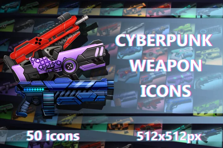 Dive into the neon battlefields of the future with Cyberpunk Gun Game Icons. It is a stunning collection of highly detailed futuristic weapons designed to bring your game’s arsenal to life. Featuring 50 carefully crafted icons, each in 512×512 pixel resolution. These icons help you integrate them into most popular game engines efficiently and quickly. Among the variety are plasma rifles (deadly energy weapons with glowing barrels and a sleek, ergonomic design), laser pistols (compact yet powerful sidearms pulsing with neon energy for fast and accurate combat), tactical shotguns (heavy weapons designed for devastating close-quarters clashes), gauss guns, and railguns (high-tech sniper weapons capable of piercing enemy armor with electromagnetic force).