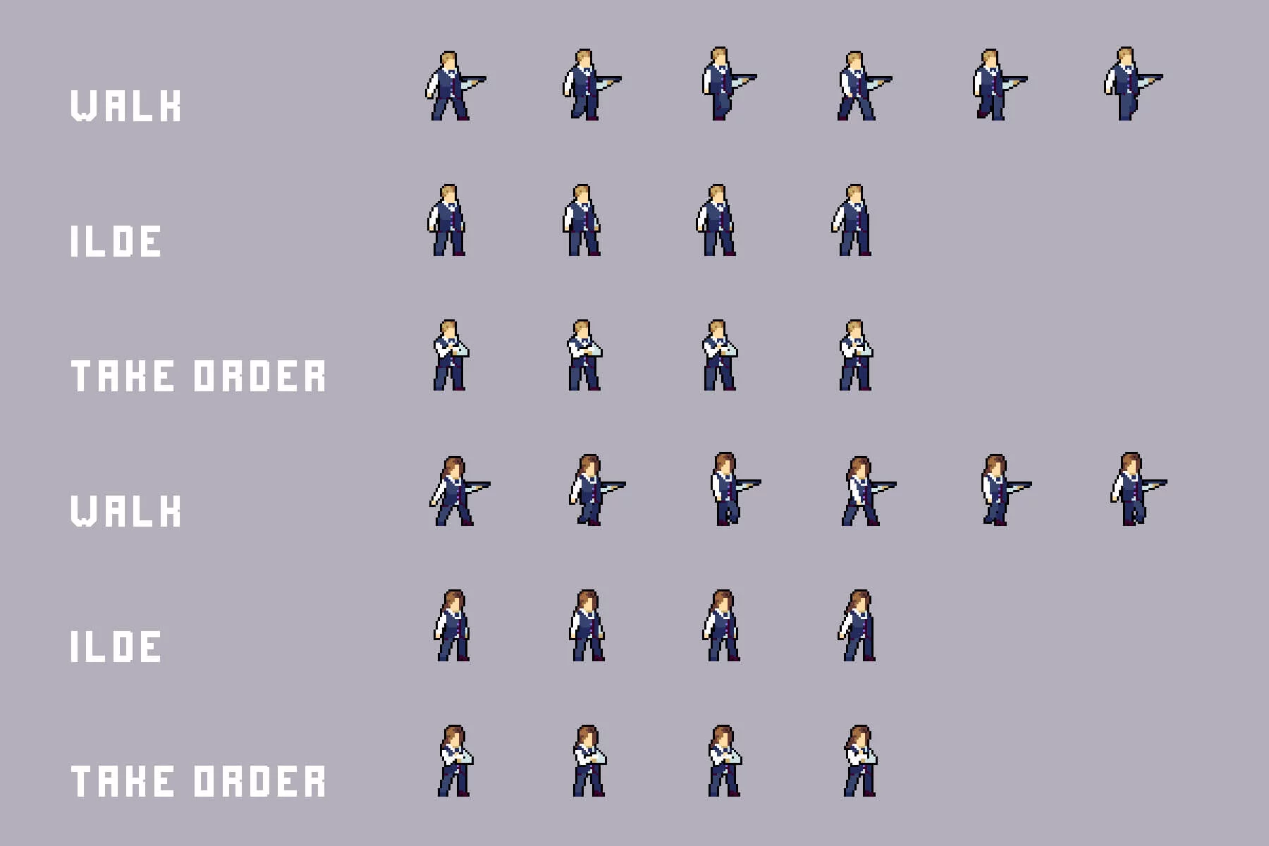 - Service Staff: bartenders and waiters with walk cycles, idle poses, order-taking animations, drink preparation, and serving actions.