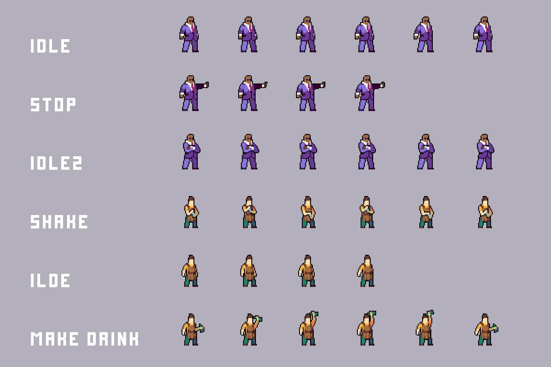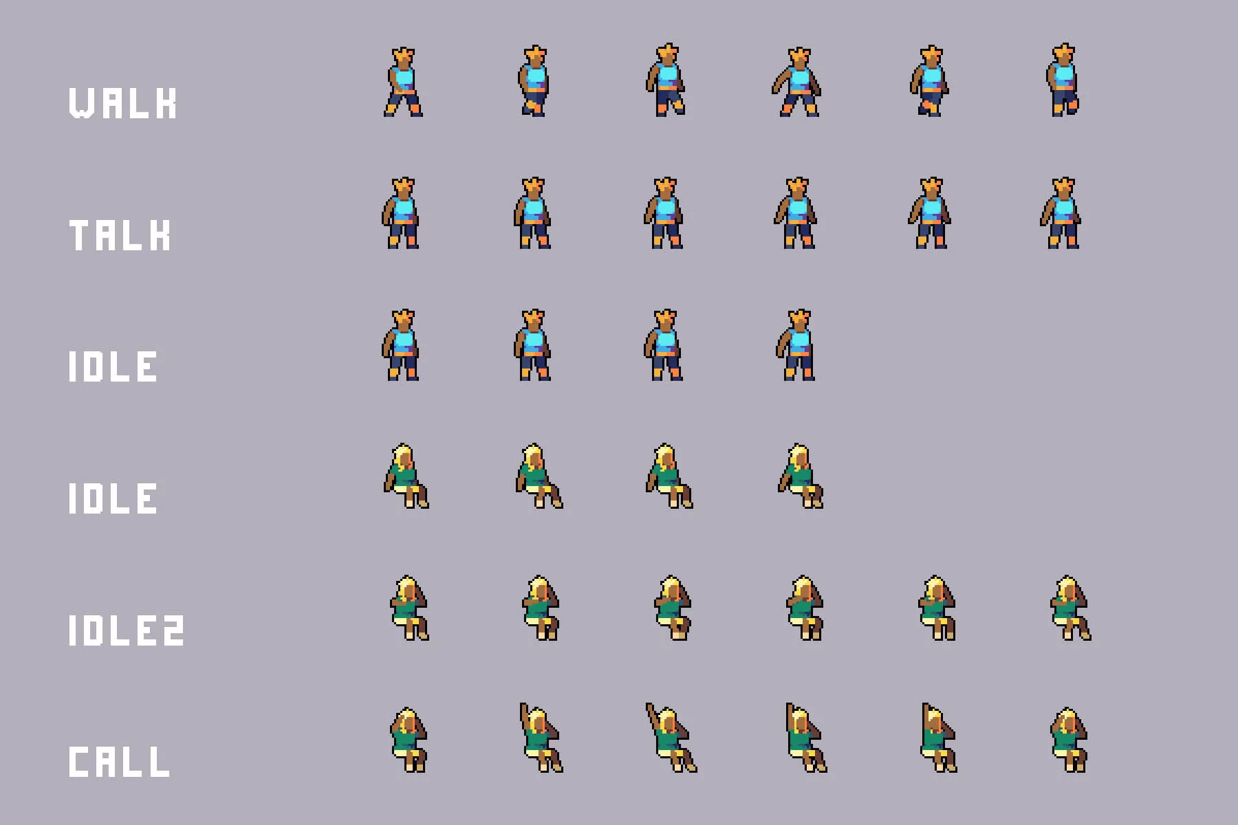- Each character includes multiple animation states.