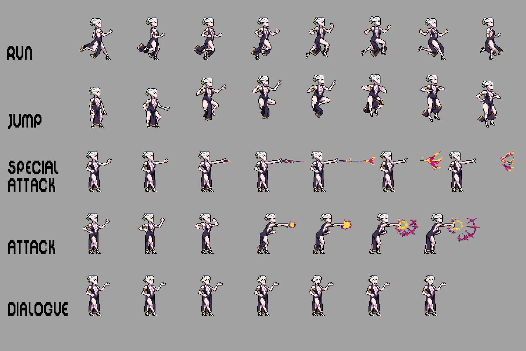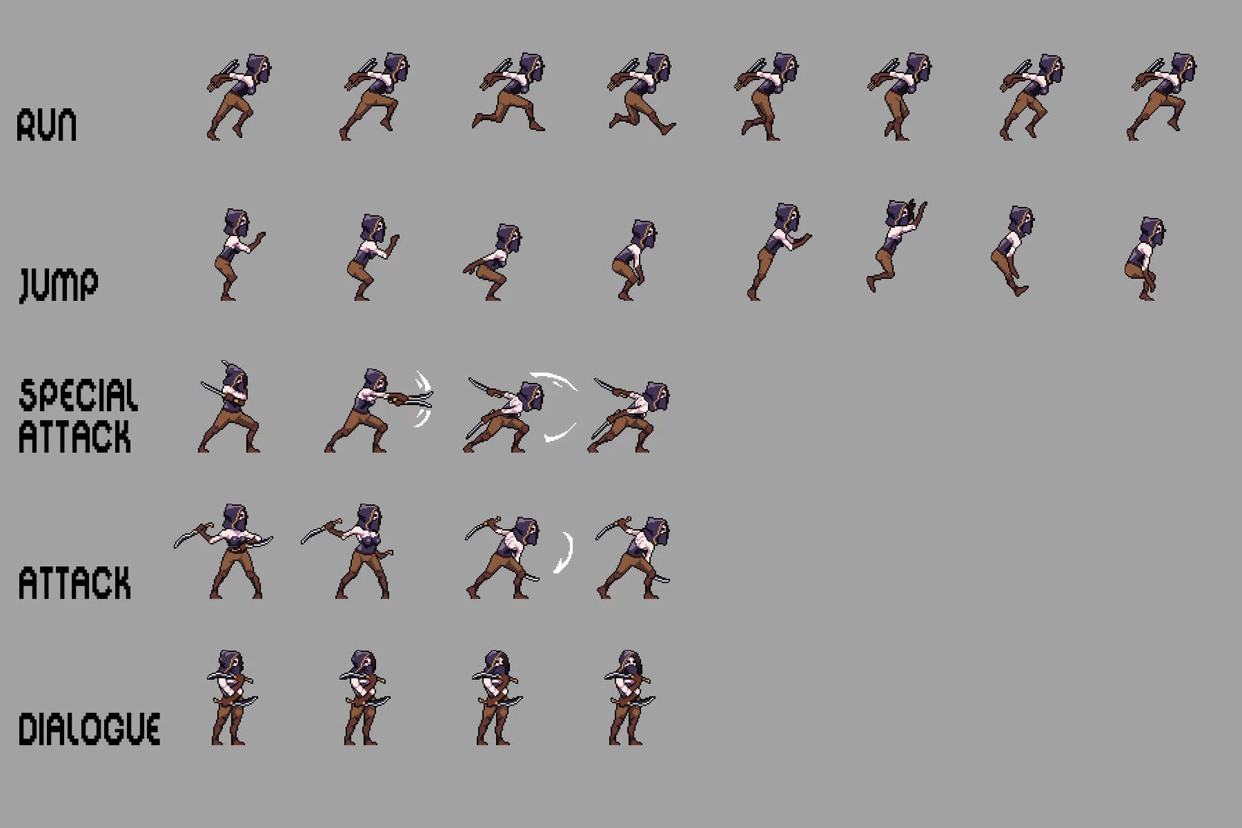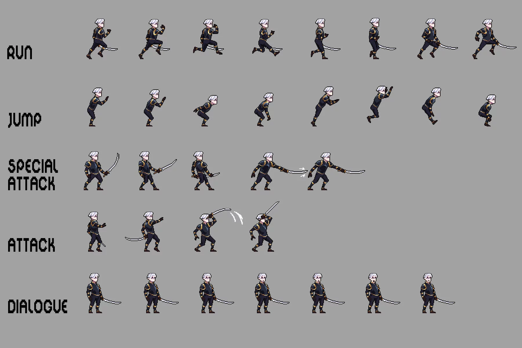 Each sprite is created using detailed pixel animation, ensuring smooth and responsive movement in a wide range of gameplay situations. The pack includes essential animations such as attacks, dialogue, runs, jumps, and more, allowing for seamless integration into most 2D game engines and beyond. Clear silhouettes and high-contrast designs ensure excellent readability even during dynamic scenes. Fully compatible with tools like Aseprite, Adobe Photoshop, and GIMP, these assets are easily customizable. You can change colors, adjust details, or expand the animation to perfectly match the visual identity and lore of your game. Whether you’re creating a hidden underground kingdom, a dark fantasy story, or a gripping pixel adventure, this pack will provide a powerful foundation for creating unforgettable characters.