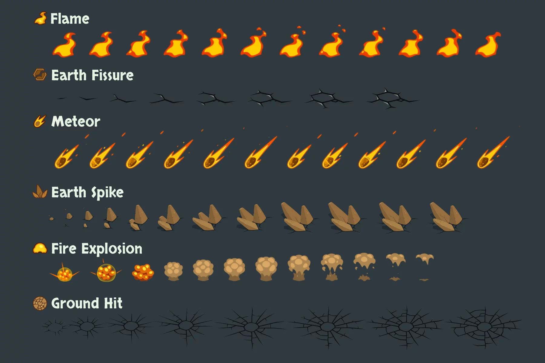 Introducing the Fire and Earth Magic Sprites for Top-Down Games, designed for creators of intense magical combat systems and immersive fantasy worlds. Ideal for roguelikes, RPGs, MMOs, top-down adventures, dungeon crawlers, tower defense, survival adventures, and action strategy games, this collection allows you to bring the power of the elements directly to the battlefield. Each animation is designed to make spells feel powerful, clear, and impressive during dynamic gameplay. It features a stylized fantasy aesthetic with smooth frame-by-frame animations optimized for top-down perspectives. The effects are designed to clearly convey hit zones, attack direction, and spell casting timing, helping players instantly understand what is happening during combat encounters. With crisp silhouettes and vibrant colors, each spell feels powerful and visually expressive.