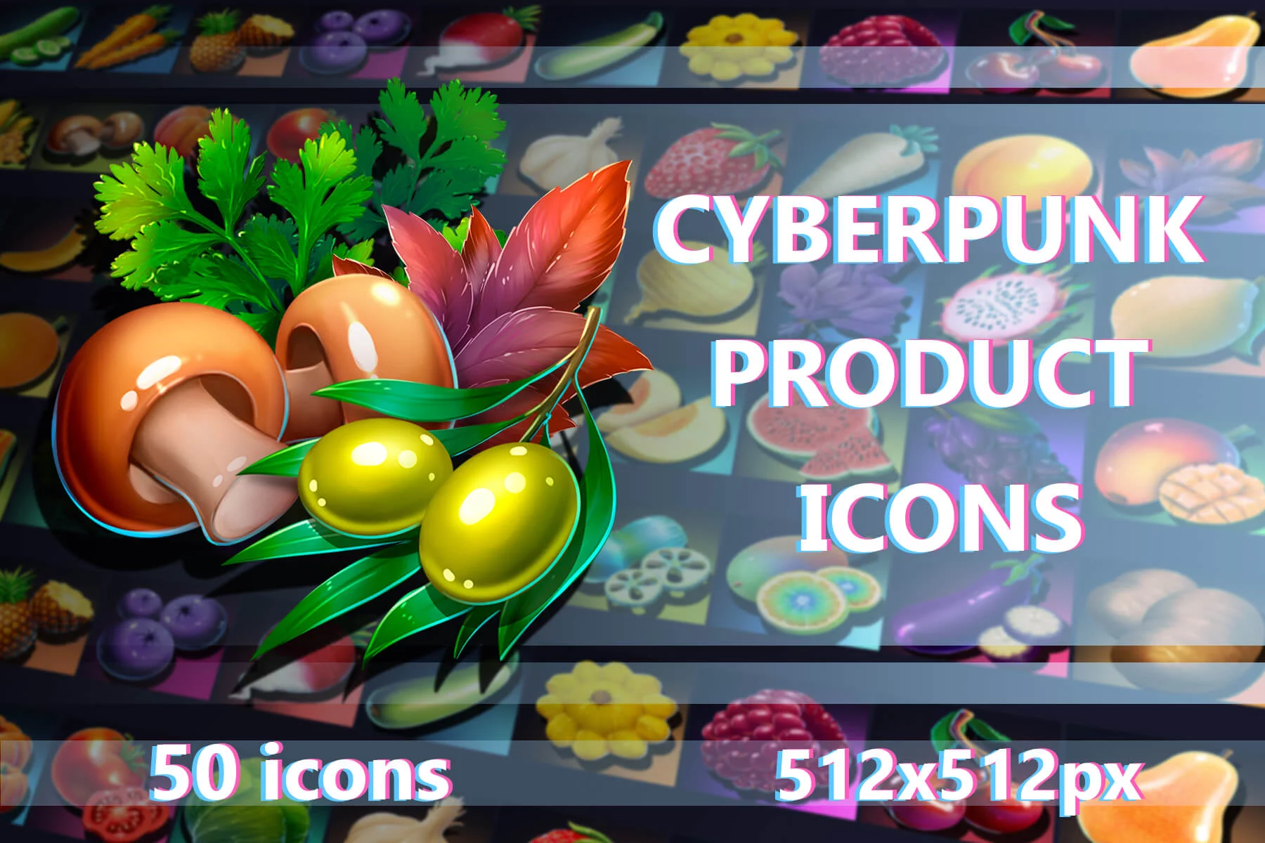 - Exotic and decorative foods include pineapples, avocados, chili peppers, olives, peas, mushrooms, and stylized flowers, bringing added variety and visual depth to any interface.