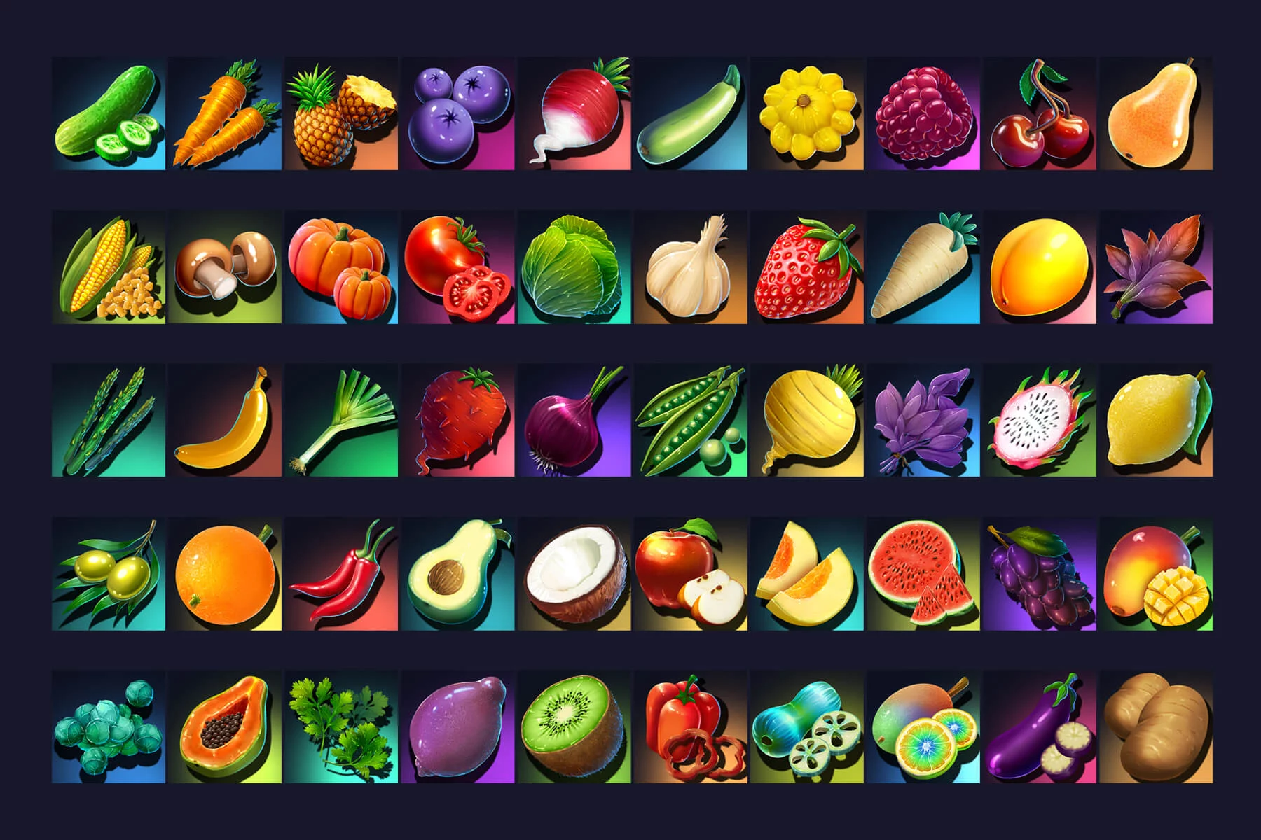 Introducing the Fruits, Berries & Vegetables Icon 512×512 Set, a rich and expressive collection designed for game developers, app creators, and digital artists who want to add freshness, color, and visual depth to their projects. Whether you’re building a farming simulator, a cooking or survival game, an MMO world, an RPG crafting system, or a casual mobile experience, this icon set fits seamlessly into a wide range of gameplay scenarios and instantly draws the player’s eye. The pack features a diverse selection of high-quality 512×512 pixel icons, each carefully crafted with smooth gradients, vivid lighting, and a polished modern aesthetic that elevates any interface or game environment.