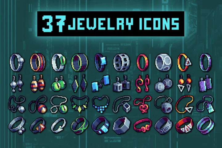 Jewelry 32×32 Pixel Icons for Cyberpunk Game is actually more than just a collection of small visuals. It is a carefully crafted set created to enhance the aesthetics and functionality of cyberpunk games. This icon set is perfect for developers looking to enrich their inventory systems, character customizations, or user interfaces while maintaining the iconic pixel art style of the genre. Inside, you will find a variety of jewelry icons, ranging from neon rings with various rubies and diamonds, futuristic eye necklaces and unusual energy cubes, to intricate music key earrings and bracelets that perfectly complement the entire look. Each piece reflects the combination of advanced technology and cyberpunk dystopia, giving your game’s characters a unique, futuristic look.