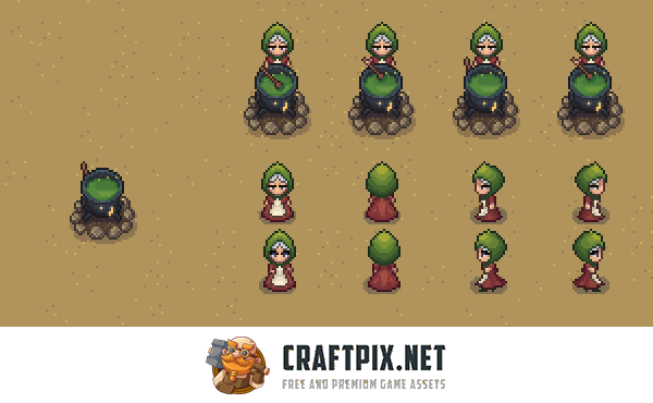 Additionally, there is one character, a girl in a green headscarf and a long brown dress. She has multiple directional vectors, can move around the map, and can brew healing potions. The top-down view ensures seamless integration into RPGs, MMOs, quests, survival games, exploration games, farming simulators, roguelikes, and story-driven adventures. Create places that players will remember, quiet huts filled with knowledge, secrets, and the subtle magic of nature.