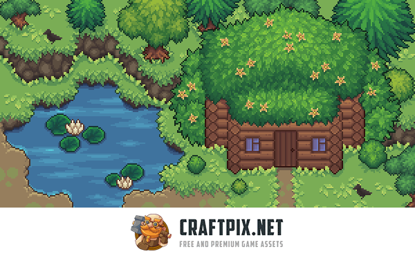 The set includes everything you need to create a complete herbalist’s environment from a top-down perspective. You will find detailed exterior elements such as leafy hut roofs, wooden walls, roofless houses, trees, bushes, and a variety of flowers, from small and solitary bellflowers to large bush flowers, as well as natural ground decorations that seamlessly fit into forest or rural maps. Animated assets are also included, such as hopping birds, water, and white lilies. These assets allow you to create a believable environment where the herbalist’s hut feels like a natural part of the landscape rather than a stand-alone structure.