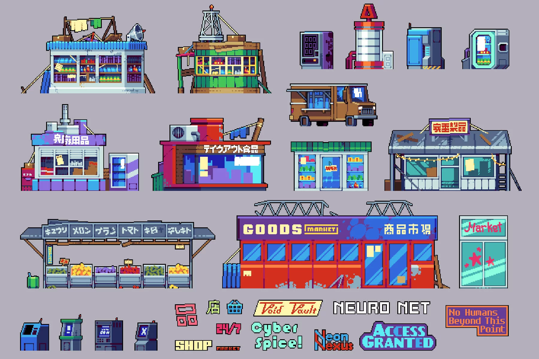 If you’re creating a cyberpunk world and want to capture the spirit of neon streets and bustling futuristic commerce, Pixel Art Market Location for Cyberpunk is your perfect companion. At the heart of every sci-fi metropolis lies the marketplace, a chaotic blend of technology, the struggle for survival, and human ambition. However, creating such a space from scratch can quickly become an overwhelming task. Without carefully crafted assets, your city can feel flat and lifeless, losing the dynamic that makes cyberpunk so unique.