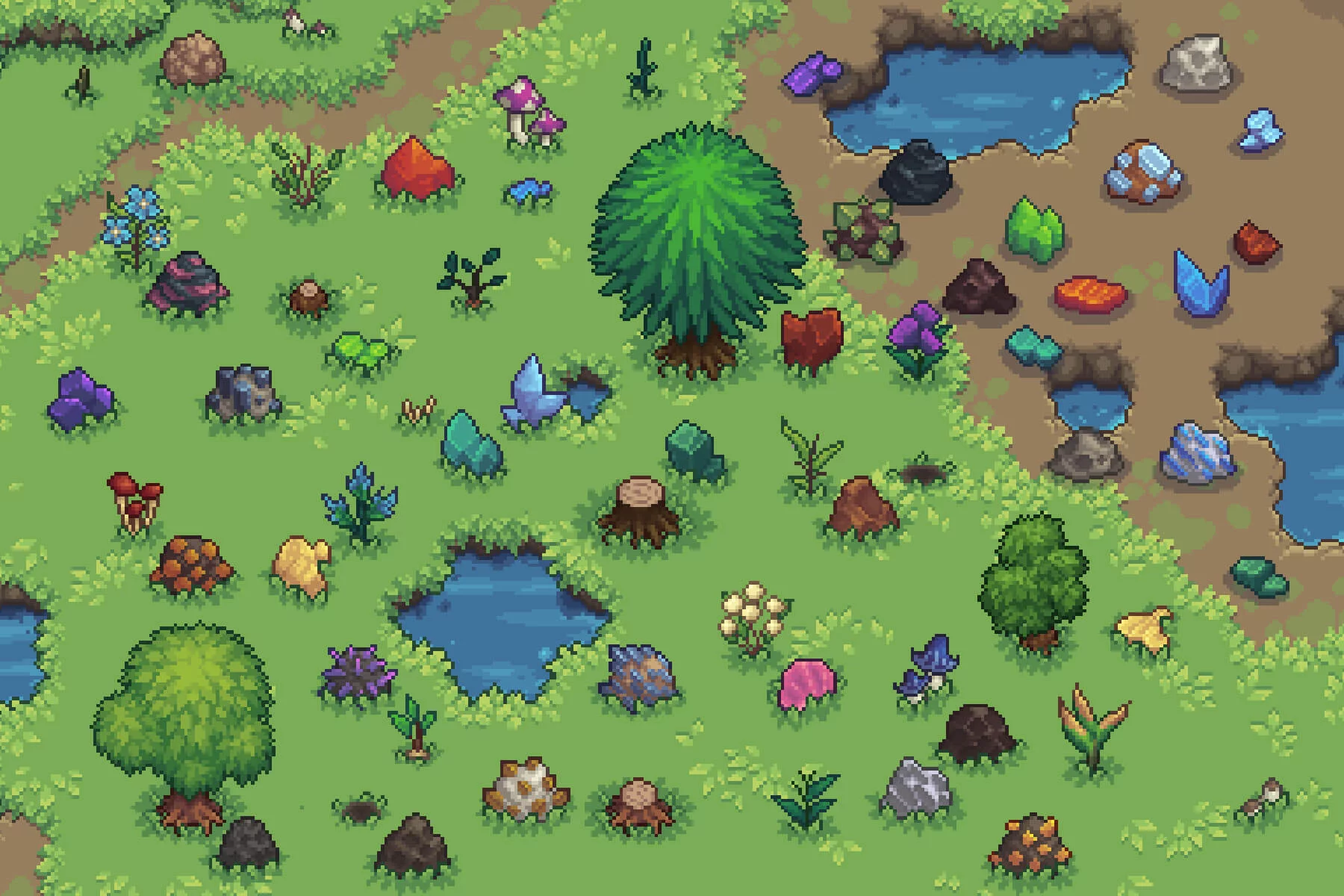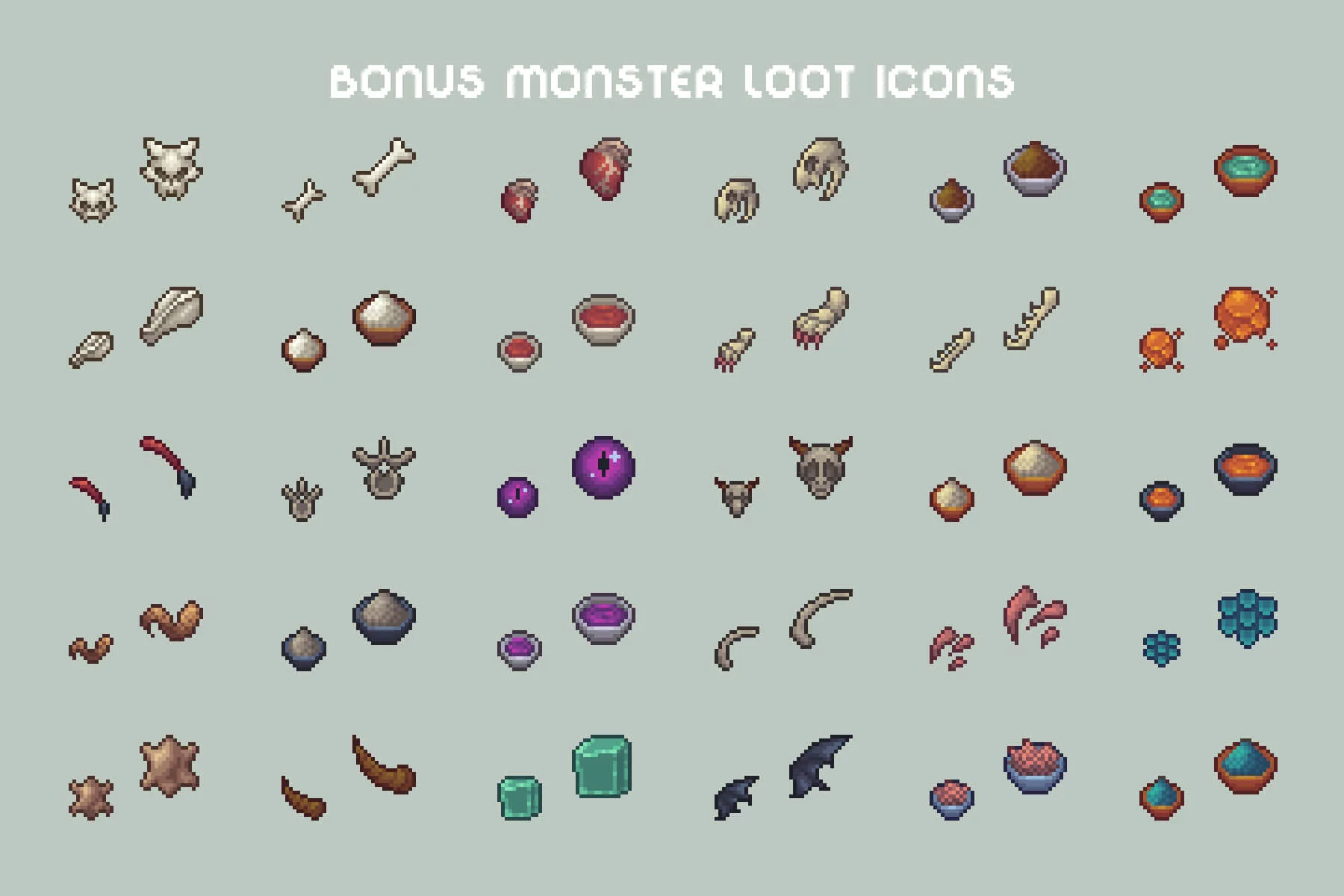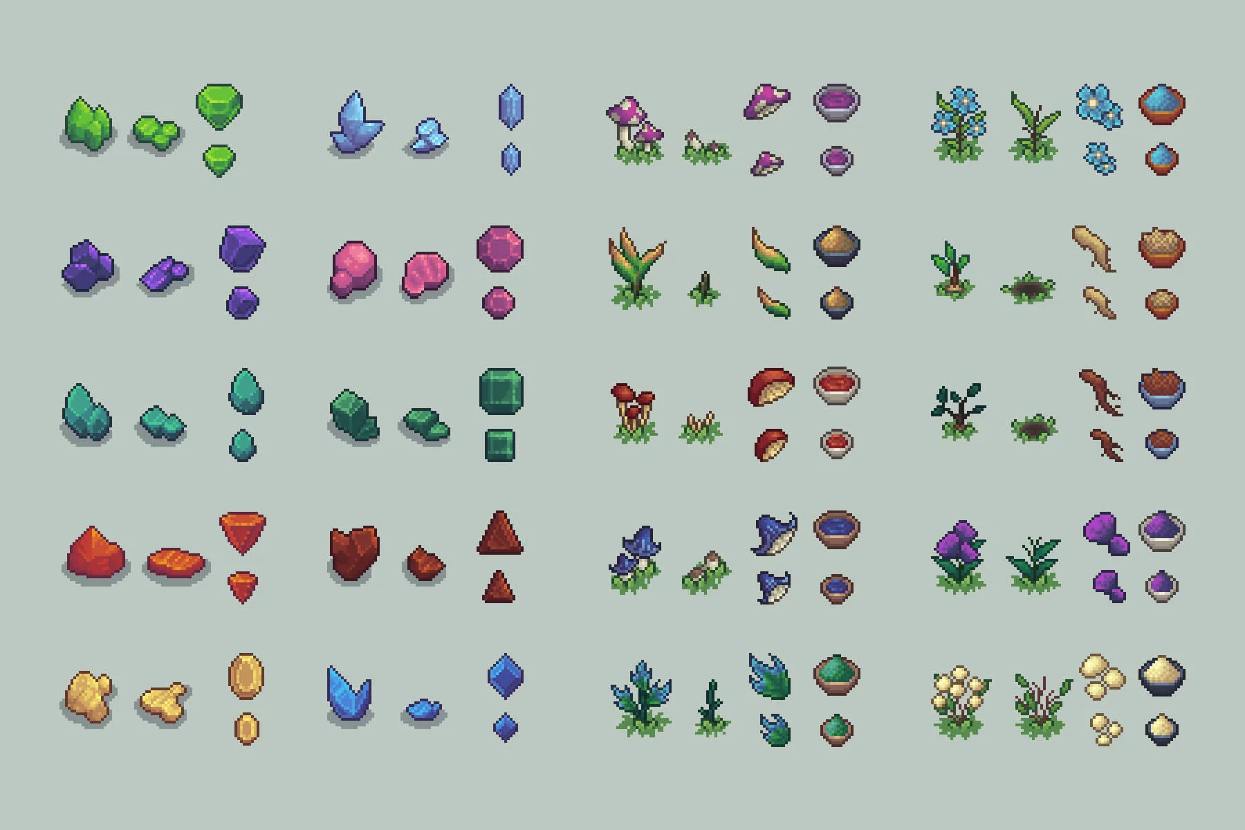 Introducing the Pixel Art Resources and Icons Basic Pack, an essential starter collection for 2D game developers looking to enrich their worlds with beautifully crafted resource collections, environments, and monster loot. Whether you’re developing a fantasy RPG, MMO, quest, farming simulator, exploration, survival, or strategy adventure game, this pack will provide everything you need to bring your resource systems to life, imbuing them with clarity, charm, and a refined retro style. This collection includes a wide range of pixel art assets designed to enhance crafting, resource gathering, and gameplay. Here you’ll find several main categories of collectibles: