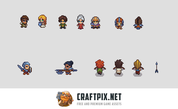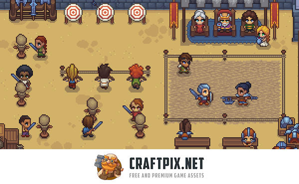 This set contains everything you need to create a living, breathing arena: weapon racks filled with swords and axes, archery targets, sparring dummies, trade tents, armor crates, individual weaponry and combat attire, shields, bags, banners, and even thrones for high-ranking officials, as well as warriors ready for battle. Thanks to meticulously crafted 16-bit pixel art, each object harmonizes perfectly, creating a cohesive environment that evokes nostalgia and dynamism. Among this spectrum, you’ll also find 12 fully animated characters, from armed warriors ready for battle to ordinary spectators, servants, and even the king. It’s also worth mentioning that all the details for constructing the level itself are included, containing tiles, walls, fences, and even floor structures. This set’s elegant structure allows you to create arenas of varying scales: from a small village arena to a grand coliseum where champions battle before an adoring crowd. You can also use Adobe Photoshop to add your own details to its structure.