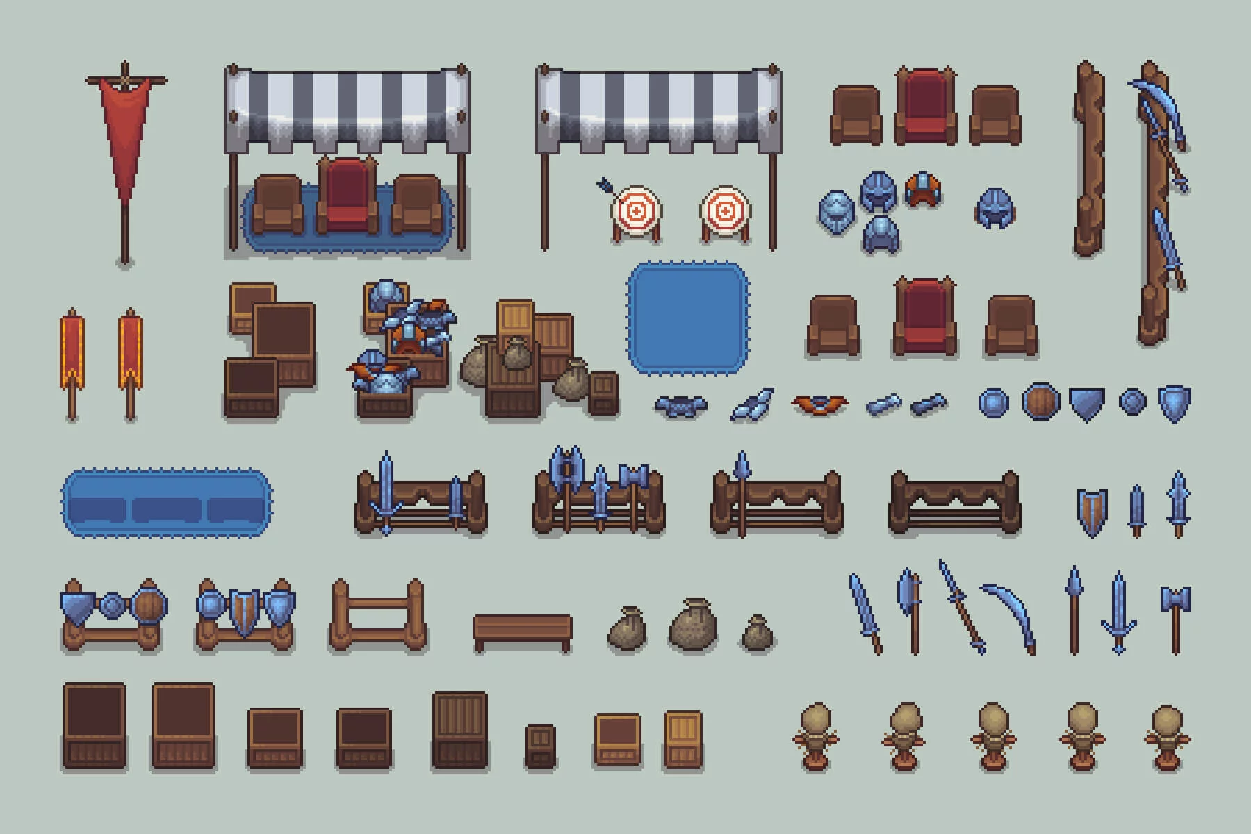 This set contains everything you need to create a living, breathing arena: weapon racks filled with swords and axes, archery targets, sparring dummies, trade tents, armor crates, individual weaponry and combat attire, shields, bags, banners, and even thrones for high-ranking officials, as well as warriors ready for battle. Thanks to meticulously crafted 16-bit pixel art, each object harmonizes perfectly, creating a cohesive environment that evokes nostalgia and dynamism. Among this spectrum, you’ll also find 12 fully animated characters, from armed warriors ready for battle to ordinary spectators, servants, and even the king. It’s also worth mentioning that all the details for constructing the level itself are included, containing tiles, walls, fences, and even floor structures. This set’s elegant structure allows you to create arenas of varying scales: from a small village arena to a grand coliseum where champions battle before an adoring crowd. You can also use Adobe Photoshop to add your own details to its structure.
