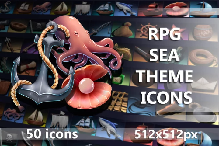 Introducing the RPG Sea Theme Game 512×512 Icons, handcrafted for adventures beyond the shoreline. Whether you’re creating a swashbuckling pirate quest, a peaceful island sim, an MMO with runner elements, combat, strategy, platformer, or an epic ocean exploration RPG, this set offers all the visual treasures you need to bring the high seas to life. This detailed set includes dozens of high-resolution icons representing all things nautical, from shipbuilding and treasure hunting to legendary sea battles and the discovery of mysterious islands.