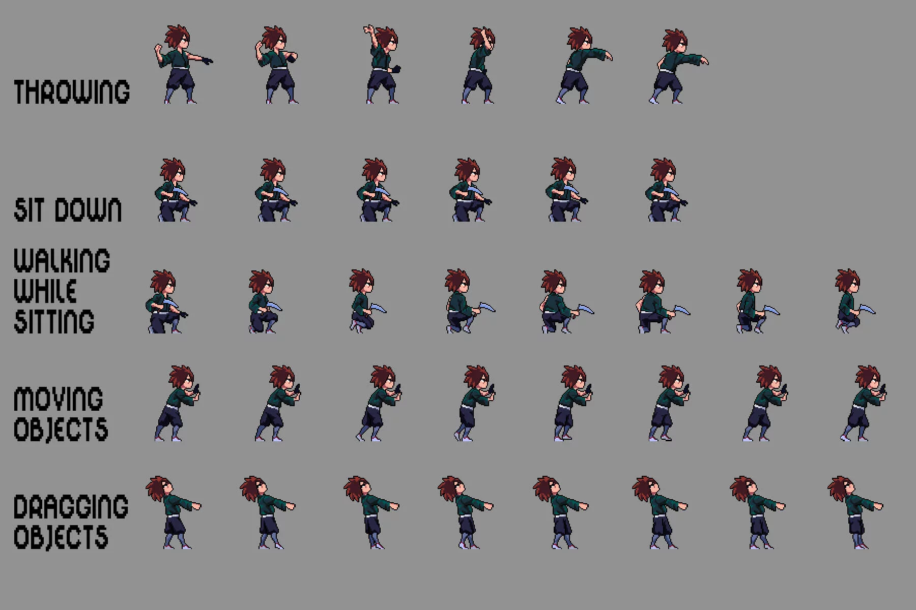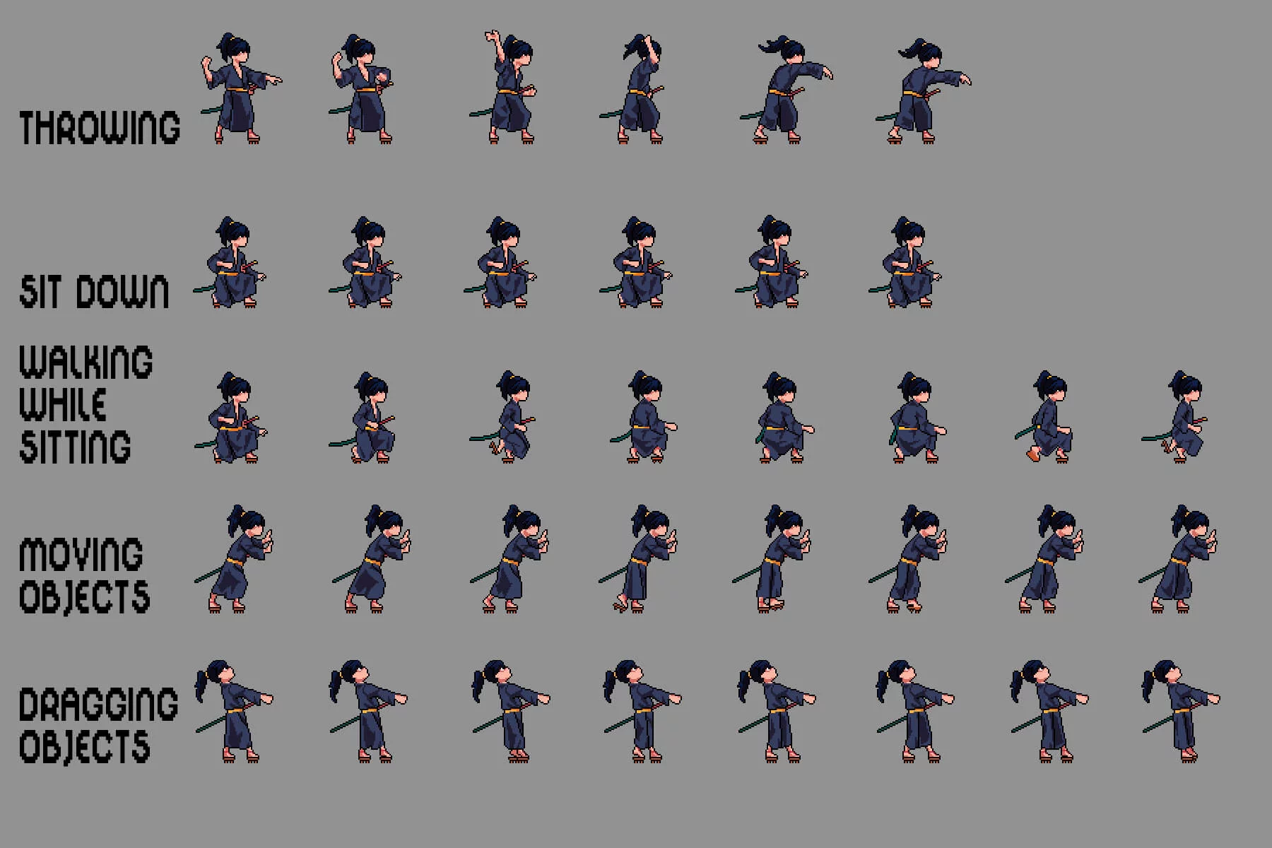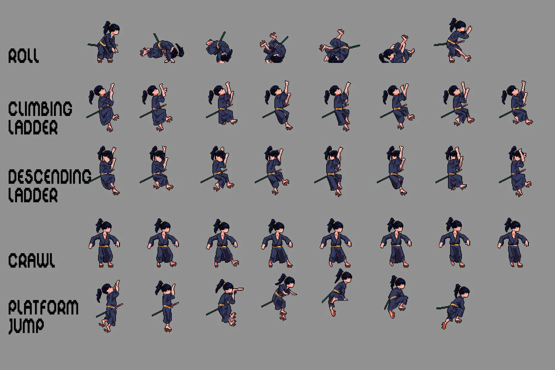 Each character is created using detailed pixel animation, emphasizing movement, fluidity, and responsiveness. You’ll find core animations such as rolling, climbing ladders, descending ladders, crawling, platform jumping, throwing, sitting down, walking while sitting, moving objects, dragging objects, and more, ensuring seamless integration with most game systems. Expressive poses and silhouettes ensure excellent readability even during dynamic battles. This set is further enhanced by its customization options. Using graphic editors like Aseprite, Adobe Photoshop, or GIMP, you can easily recolor clothing, adjust hairstyles, or add weapons and accessories to match the lore and visual style of your game. Whether you’re creating a hidden ninja village, a clan war storyline, or a thrilling anime-style adventure, this set provides the perfect foundation for creating memorable and dynamic characters.