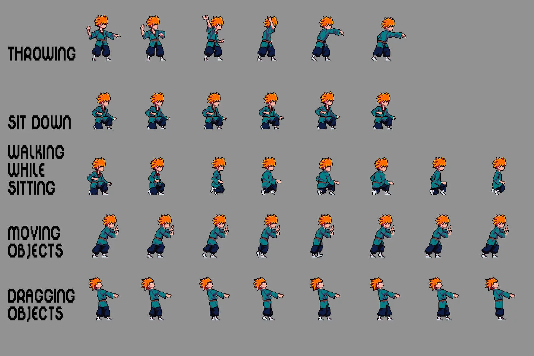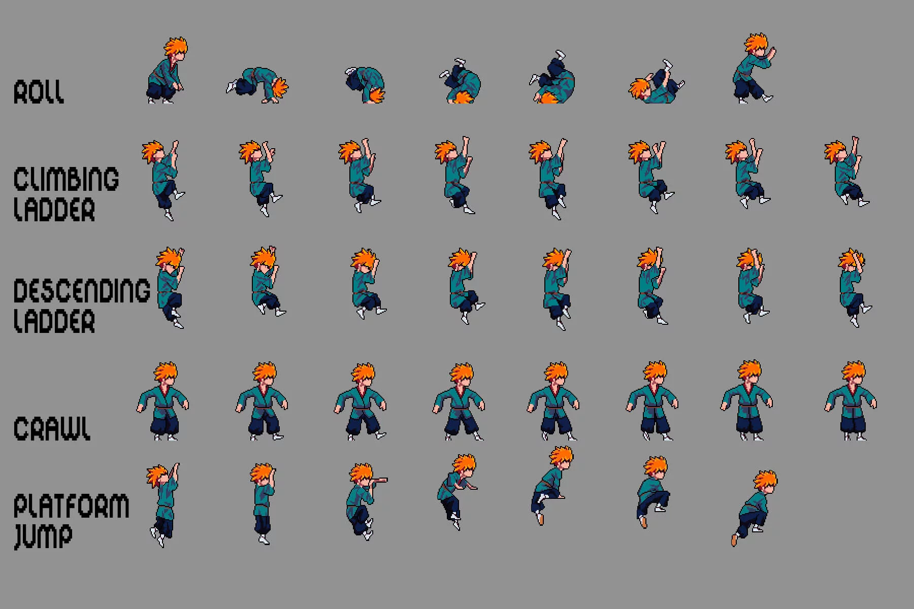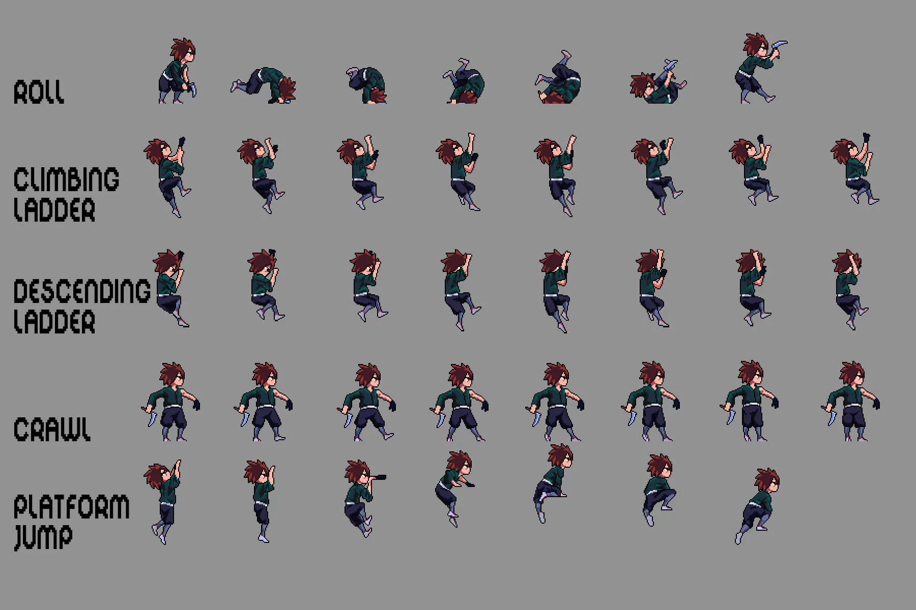 Each character is created using detailed pixel animation, emphasizing movement, fluidity, and responsiveness. You’ll find core animations such as rolling, climbing ladders, descending ladders, crawling, platform jumping, throwing, sitting down, walking while sitting, moving objects, dragging objects, and more, ensuring seamless integration with most game systems. Expressive poses and silhouettes ensure excellent readability even during dynamic battles. This set is further enhanced by its customization options. Using graphic editors like Aseprite, Adobe Photoshop, or GIMP, you can easily recolor clothing, adjust hairstyles, or add weapons and accessories to match the lore and visual style of your game. Whether you’re creating a hidden ninja village, a clan war storyline, or a thrilling anime-style adventure, this set provides the perfect foundation for creating memorable and dynamic characters.