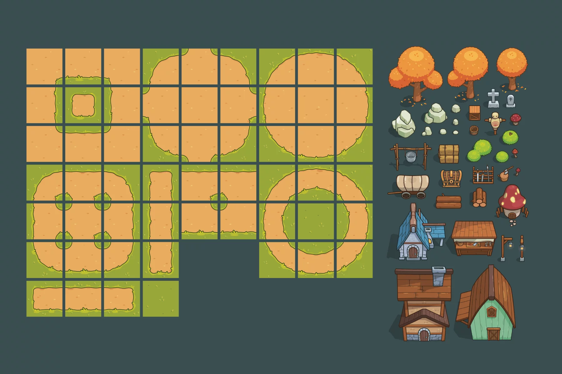 Each piece is designed in a smooth vector style, allowing you to easily resize, recolor, or modify it without losing quality. You can edit each element using tools like Adobe Illustrator, Affinity Designer, or Inkscape, allowing you to fully customize the tileset to suit your project’s aesthetic. Whether you’re creating a tranquil autumn forest, a bustling village market, or a story-driven adventure, this set brings the warmth of autumn right into your game, helping you create vibrant, welcoming, and wonderfully lifelike worlds.
