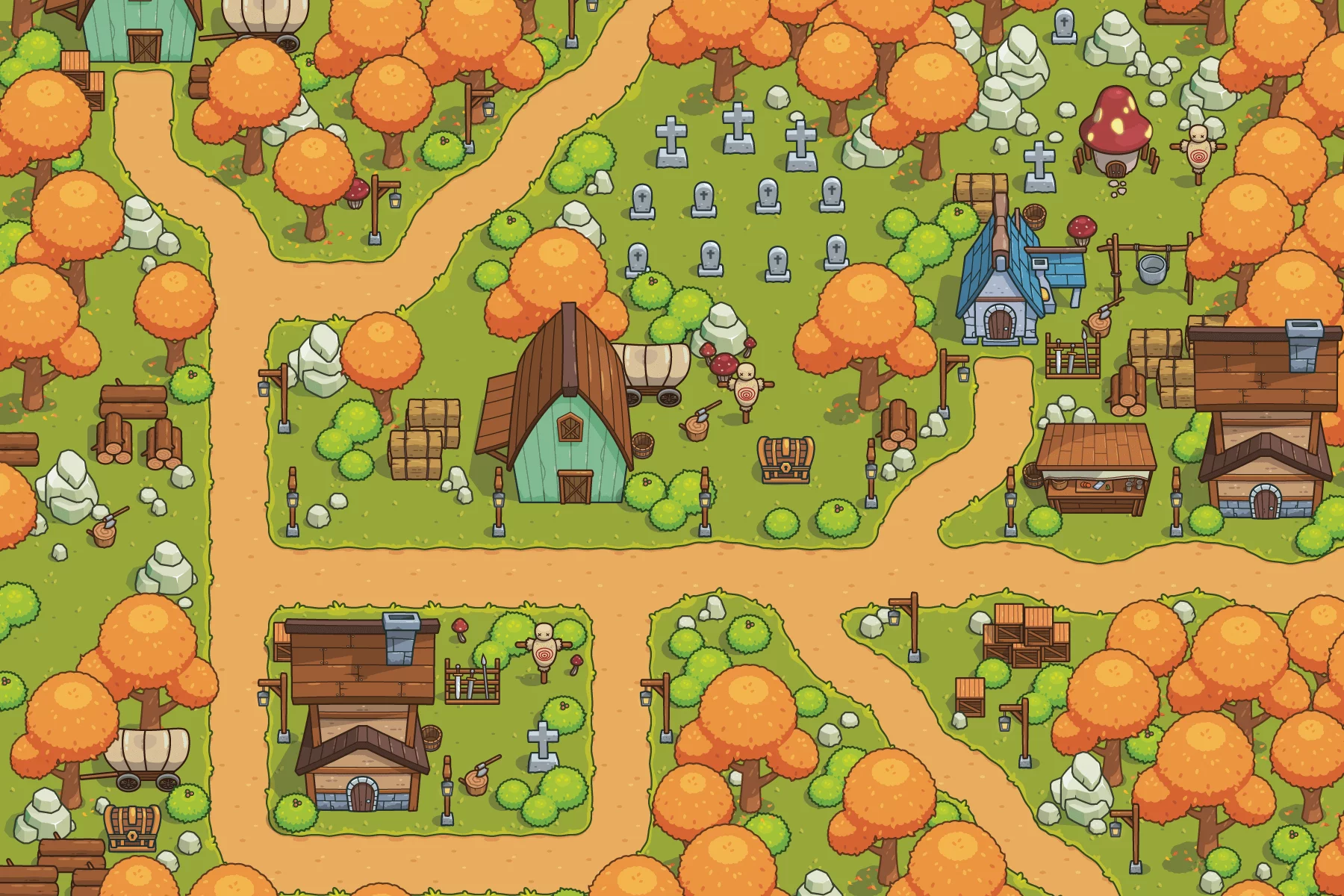 - Natural Elements: Golden autumn trees, lush bushes, rocks, mushrooms, haystacks, and small decorations will bring your forests and villages to life, adding a festive atmosphere.
