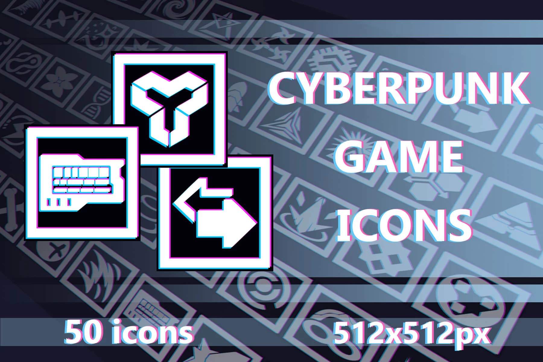 Immerse yourself in a world where neon lights shimmer against steel horizons, and every decision pulsates with electric consequences, with the Simple Cyberpunk Game Icons Pack 512×512. More than just a discreet collection of interface elements, it’s the visual heartbeat of futuristic worlds driven by power, technology, and unbridled digital intensity. Designed for those who want their interfaces to look vibrant, energetic, and uncompromisingly cybernetic. Ideal for cyberpunk RPGs, MMOs, sci-fi shooters, roguelikes, strategy, adventure, survival, and futuristic mobile games, the diverse collection features 512×512 pixel icons meticulously crafted with bold silhouettes, crisp geometry, and a striking aesthetic accented with neon.
