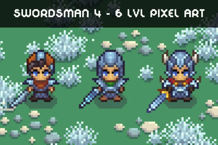 Introducing the Swordsman Level 4–6 Pixel Character Top-Down Sprite Pack, an exciting new chapter in your hero’s development. Designed for classic top-down 2D RPGs, survival stories, epic fantasy adventures, runners, combat, MMOs, exploration, quests, travel, and more, this pack showcases a more experienced, battle-hardened swordsman evolving into a full-fledged warrior.