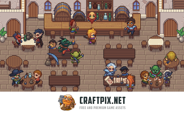 Introducing the Tavern Top-Down Pixel RPG Asset Pack. It is the perfect set for game developers looking to bring their medieval or fantasy worlds to life. This collection captures the warmth and atmosphere of a bustling tavern. It’s the perfect place for your heroes to gather, share stories, plan quests, or engage in a good old-fashioned brawl. Open the archive and in minutes, you’ll discover a wide range of detailed pixel assets that will allow you to create a complete tavern interior:
