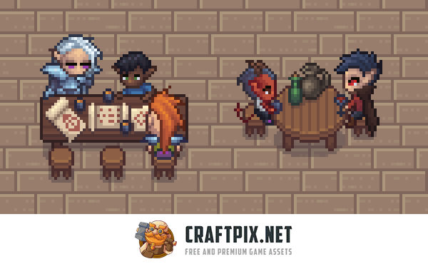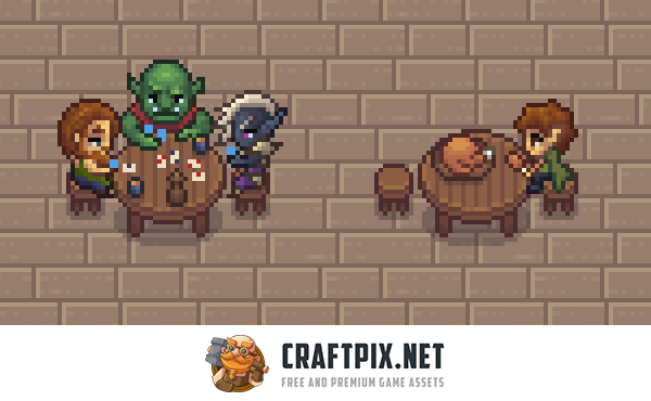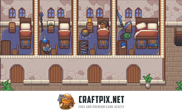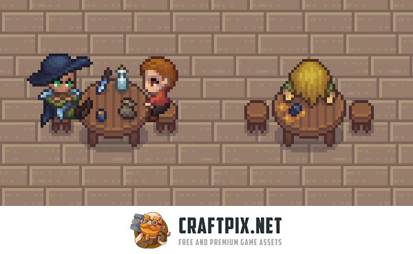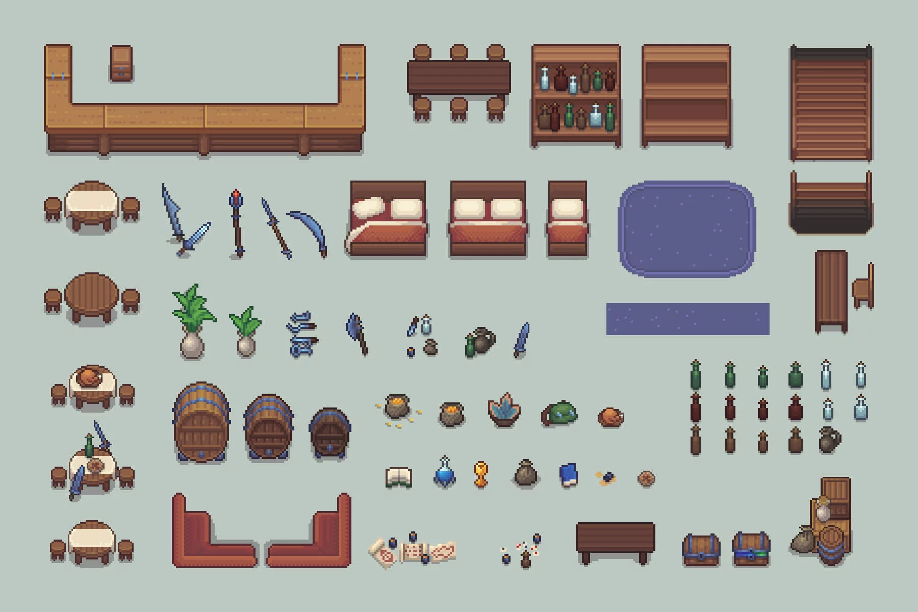 Each sprite is created from a top-down perspective and polished in a cozy pixel art style. This ensures seamless integration into RPGs, MMOs, medieval themed adventures, roguelikes, simulators, or fantasy combat games. Whether you’re designing a quiet village inn or a legendary adventurers’ hall, this asset set provides everything you need to make your world feel alive and lived-in. All elements are modular and fully customizable in editors like Adobe Photoshop, giving you the freedom to rearrange or recolor assets to suit the atmosphere of your game.