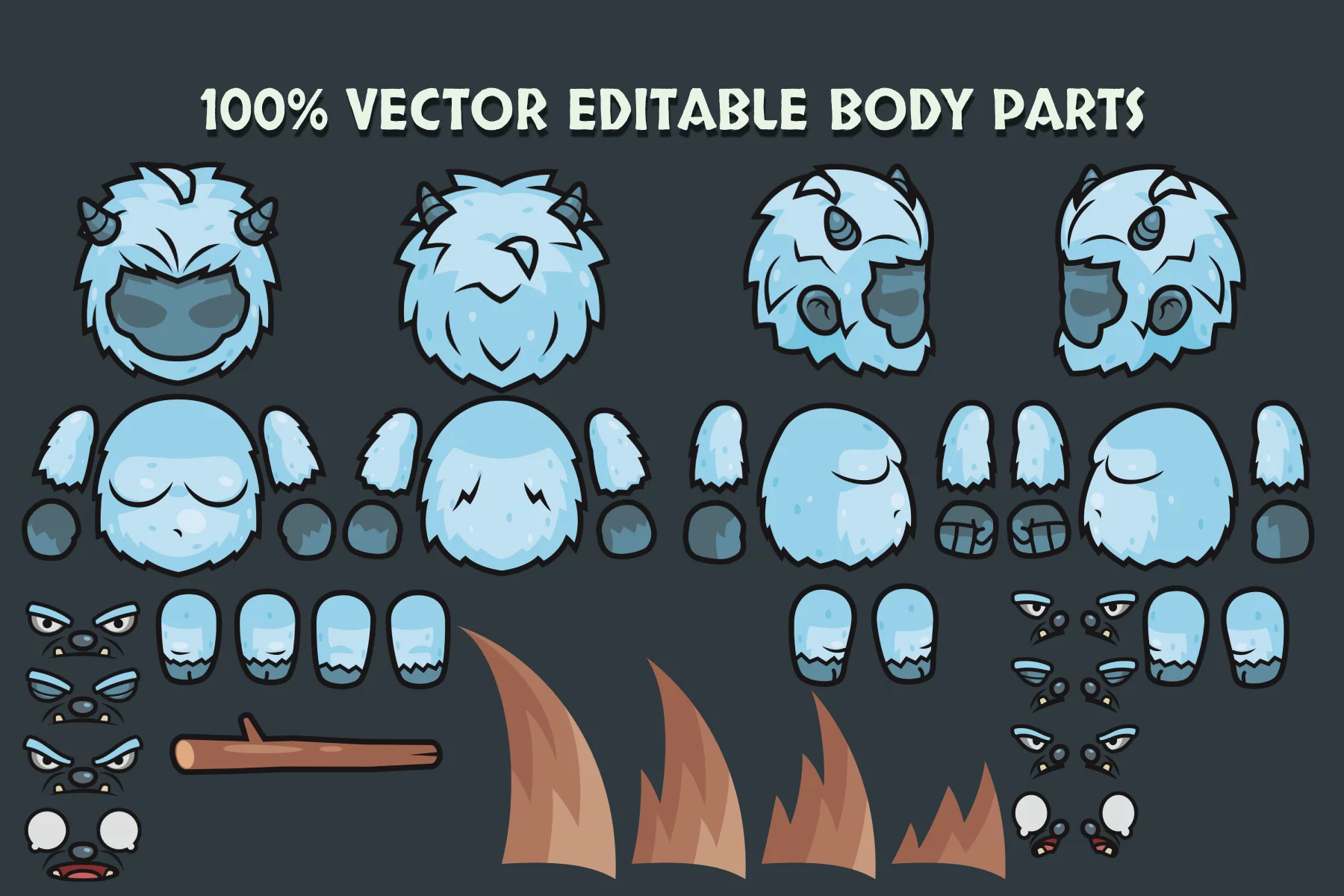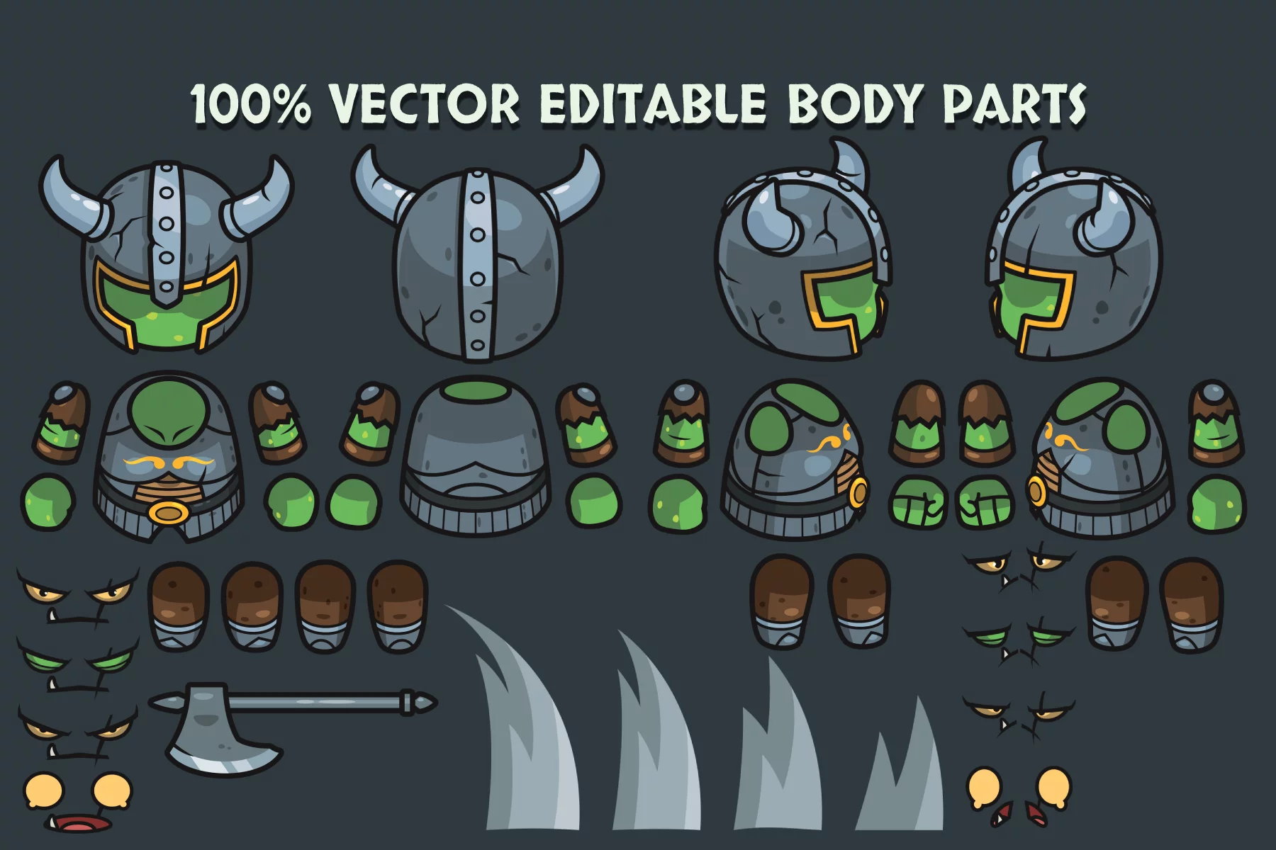 Each boss is rendered in a clean, easy-to-read, top-down style, ensuring clear visibility during intense combat scenes. Crisp contours and expressive details make these characters stand out even in tense scenes. Their visual design helps players immediately understand threat levels, attack patterns, and thematic roles. All elements are fully customizable and easily adaptable in vector editors like Adobe Illustrator, allowing you to adjust colors, effects, and details to suit the unique atmosphere of your game. Additionally, to make adjustments easier, each character is stored with separate body parts, allowing you to more easily create and design.