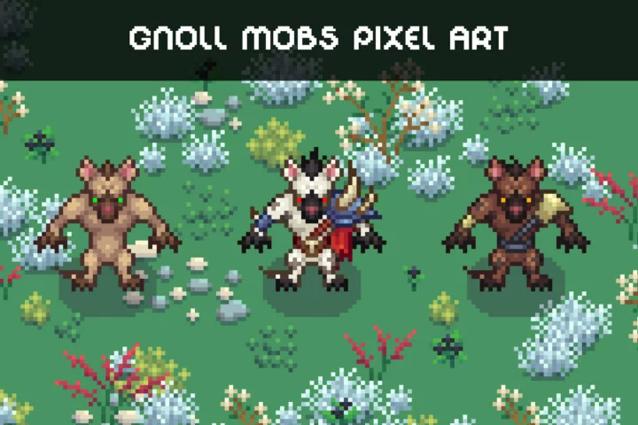 Get ready to challenge your players with the unique Top-Down Pixel Gnolls Character Pack. Oddly enough, its uniqueness lies in the fact that no matter how creatively you decide to use them – battles, RPG and MMO adventures, strategy games with runner elements, survival challenges, or even fantasy exploration – these characters fit perfectly.