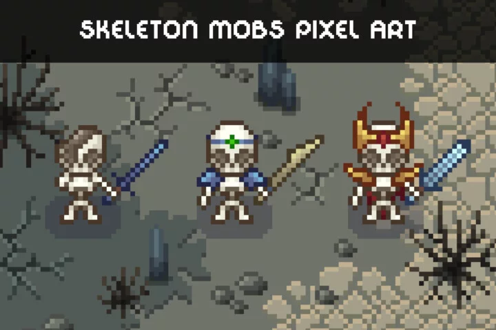 Step into the shadows of forgotten fields, scarred by years of battle and thousands of undead, with the Top-Down Pixel Skeletons Character Sprite Pack. It is a chilling addition to any RPG, strategy, dungeon crawler, MMO, runner, travel, exploration, survival, quest or adventure game. These undead warriors have risen again. Cursed, they must roam the lands, guard ancient treasures, or march under the banner of a sinister necromancer. Whether they are low-level minions or fearsome enemies, these skeleton warriors will bring exciting encounters to your pixel world.
