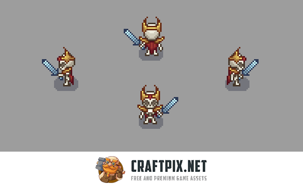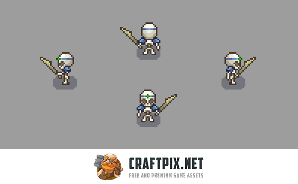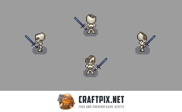 All three skeletons represent frightening, experienced warriors, each with a thousand years of battle experience. They can become powerful opponents for anyone looking for adventure, wanting to explore a new cave, or trying to find new loot. Not only are they unique in appearance, but they also have an interesting movement animation, which includes hurt, death, run, idle, walk, and attack. Additionally, they feature four directions of movement – front, back, left, and right. This greatly simplifies the movement of characters on your map, making their appearance absolutely unexpected for players. Their editable format allows them to be easily customized in Aseprite, Adobe Photoshop or other pixel art software, making them ideal for any game project.